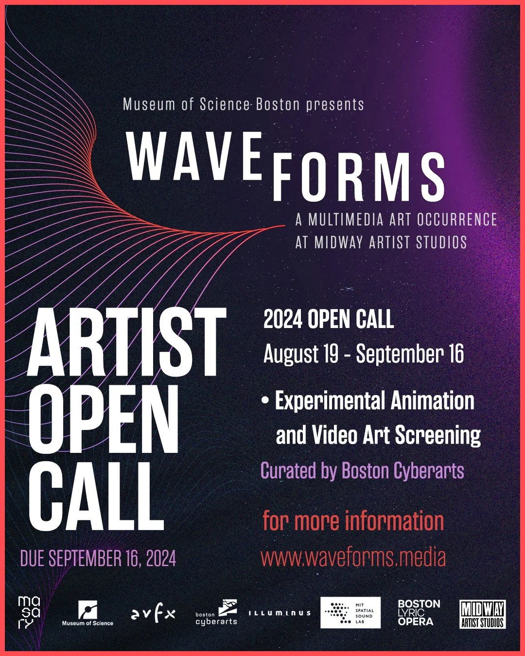 WaveForms was established to provide resources of space, equipment, production, curation, and mentorship to multimedia practitioners in our region and beyond. On October 25, Midway Artist Studios will come to life with activations such as: projection-mapped video installations, spatial sound theater, audio visual performance, and experimental animations & video art. Artists are invited to submit work for consideration for the experimental animation and video track this year curated by Boston Cyberarts.