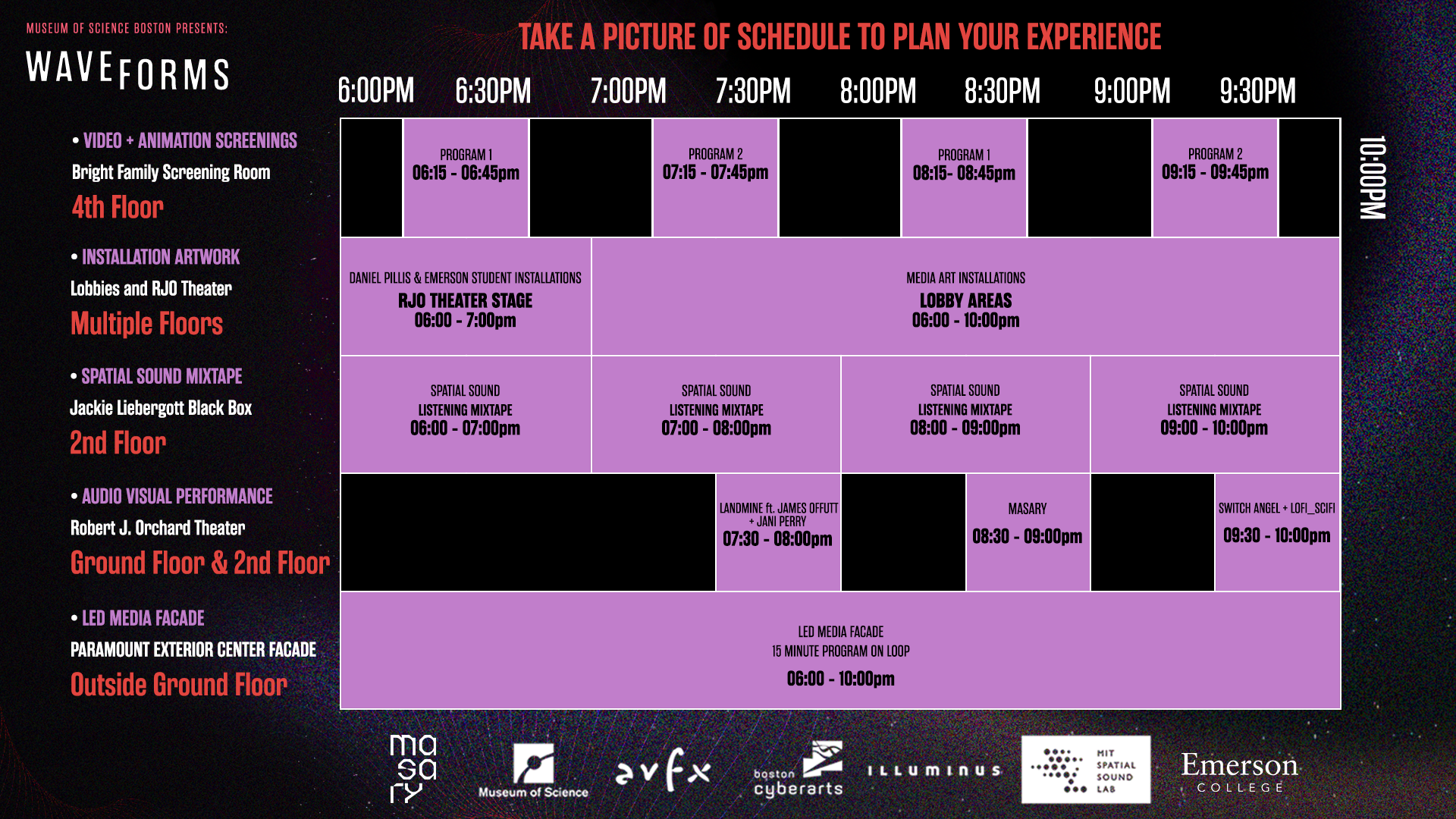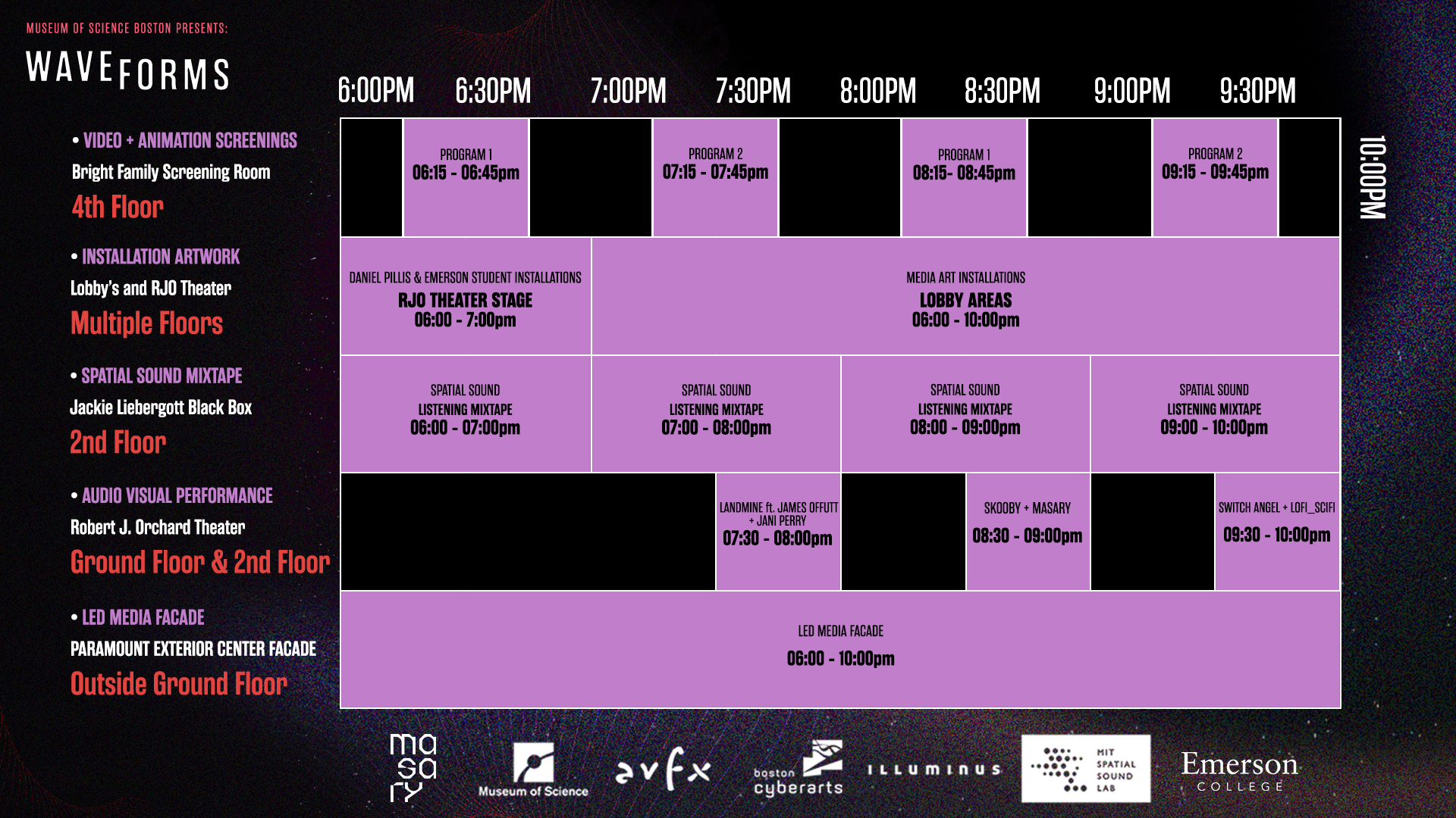 Presented by Museum of Science Boston, WaveForms 2026 is hosted at the Emerson Paramount Center on February 12, 2026 • 6pm-10pm. The event programming takes place through curatorial partnerships featuring five distinct artwork tracks: