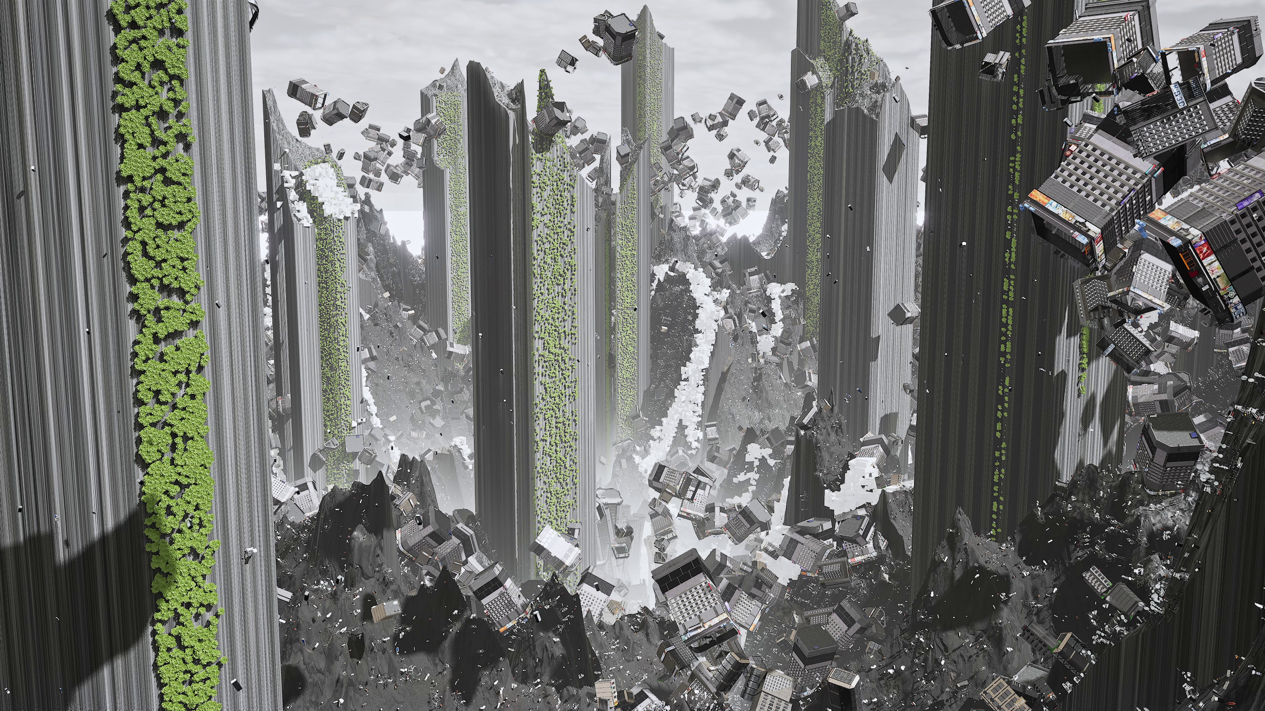 It would be hard to not draw a line between the fractured, overlapping, on-the-move cityscape of Michael Overton-Brown’s Metastasis and the feature-length films Inception or Dr. Strange. This is the down side to working in a medium and with imagery that is ruled by directors like Christopher Nolan and the all-consuming Marvel Cinematic Universe, titans whose collective cultural footprints are so pervasive they are hard to escape. But maybe that’s the point.