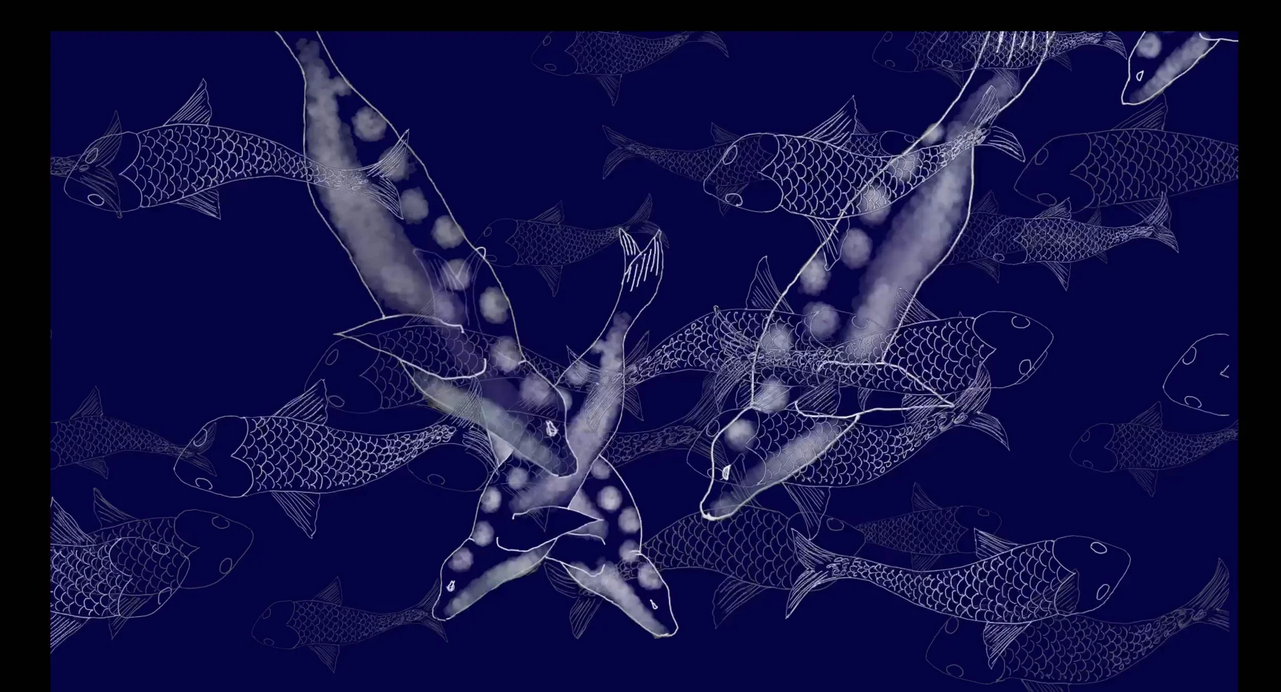 Her work, Selkie, a monochromatic experience, embodies all of these interests. It starts with white outline-based fish that the negative space of the vast blue ocean brings to the forefront. While it looks like a work made from traditional printmaking, it is animation. After a while the scale gets progressively bigger, then seals appear to the sound of water and xylophone. The reverb makes it sound like echolocation. Fish morph into seals which morph into a femme body swimming in the water who emerges from the water looking at the land. In the next scene, a pregnant person is on the shore with a male-presenting figure in the background. More exposition is given to the femme-presenting person. The pregnant person takes off their clothes and goes into the water. The first figure turns into a bird; then many birds circle around in the sky until they are far away from our view. Therefore, this story feels folkloric or primordial.